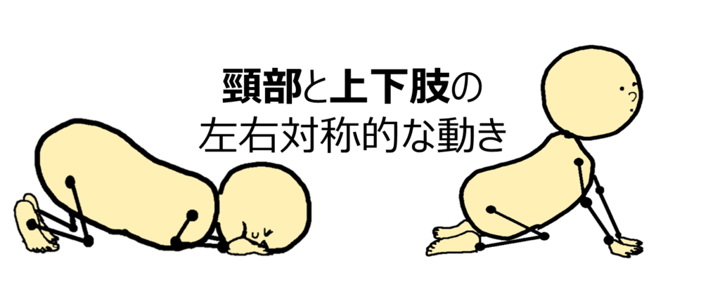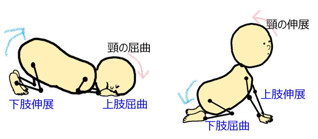 四つ這い位でくびを屈曲した場合。上肢は屈曲し、下肢は伸展します。その結果、臀部が上がります。四つ這い位でくびを伸展した場合。上肢は伸展、下肢は屈曲します。その結果、臀部が下がります。いずれにしても頭部、上下肢は常に対称になっています。