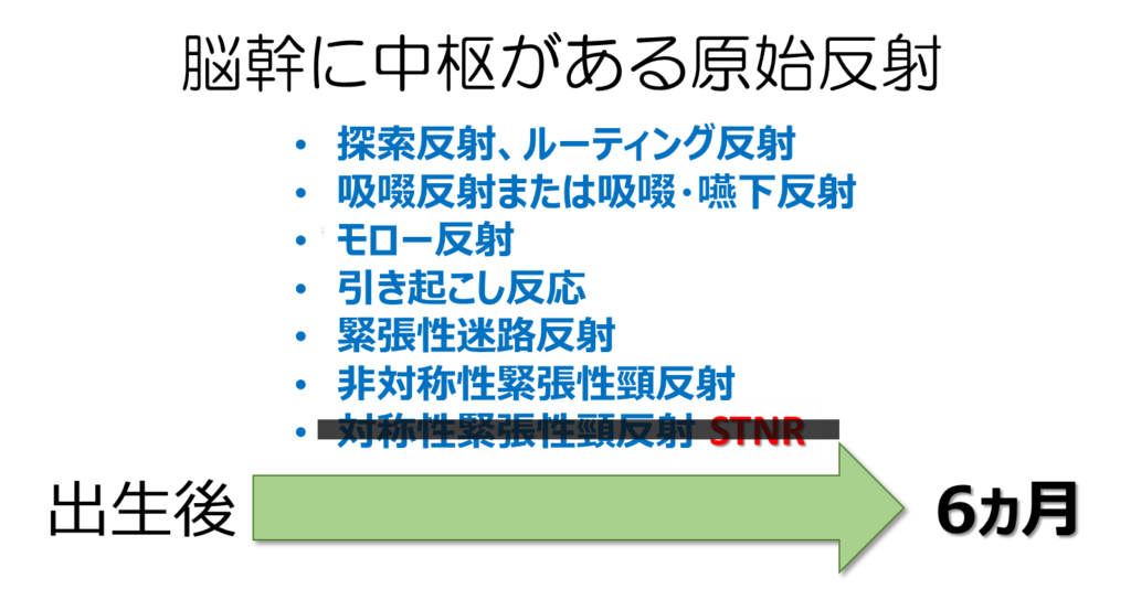 脳幹に中枢のある、探索反射、吸啜・嚥下反射、モロー反射、引き起こし反応、緊張性迷路反射非対称性緊張性頸反射は、6カ月ころまでに消失します。しかし、STNRは出現時期と消失時期が他の原始反射と異なります。