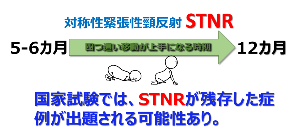 STNRは、やく6カ月ころに出現し、12かげつころに消失します。この期間に、四つ這い移動が上達します。しかし、脳に障害がある場合は、原始反射が12カ月以降も残存する場合があります。残存するということは、12カ月以降もSTNRが各姿勢で見られるということです。国家試験では、STNRが残存した症例が出題される可能性があります。