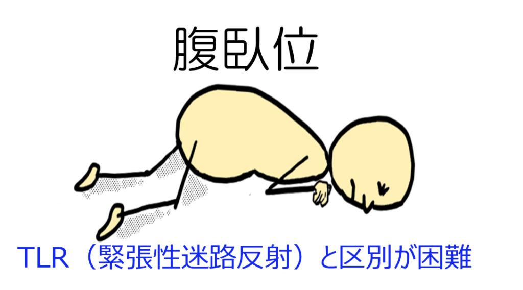 このような症例の場合、腹臥位でSTNRが残存していることが考えられます。頸部屈曲にともない、上肢が屈曲しています。