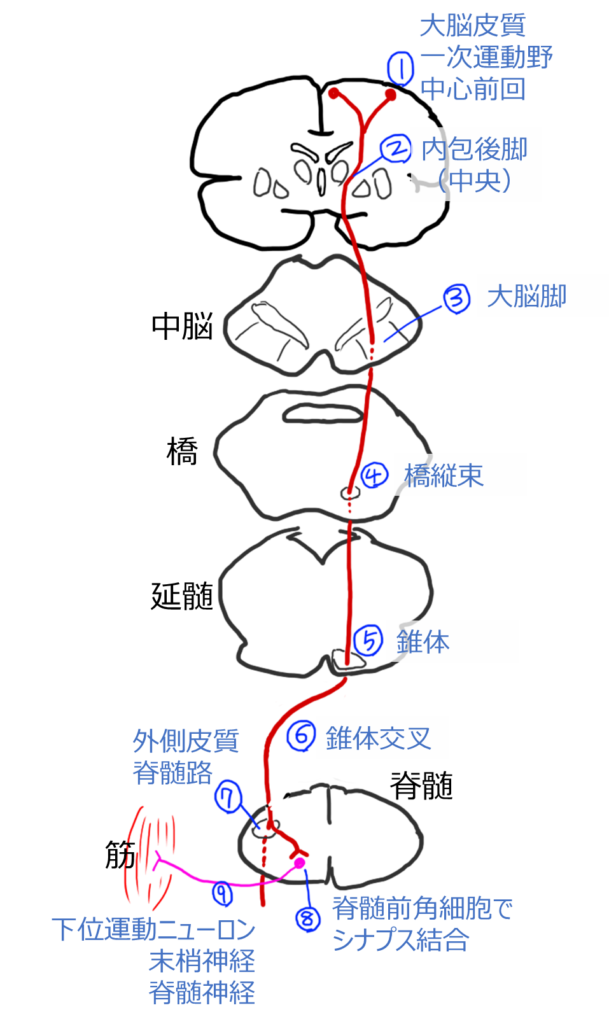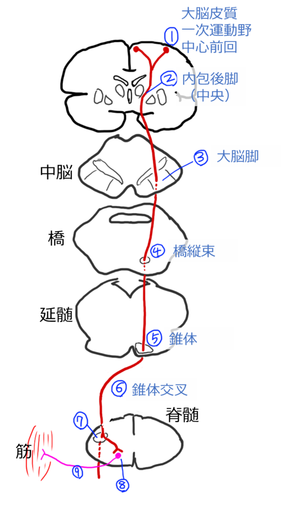 一次運動野(4野)→ 内包後脚 →大脳脚(中脳)→ 橋→ 延髄錐体【錐体交叉】