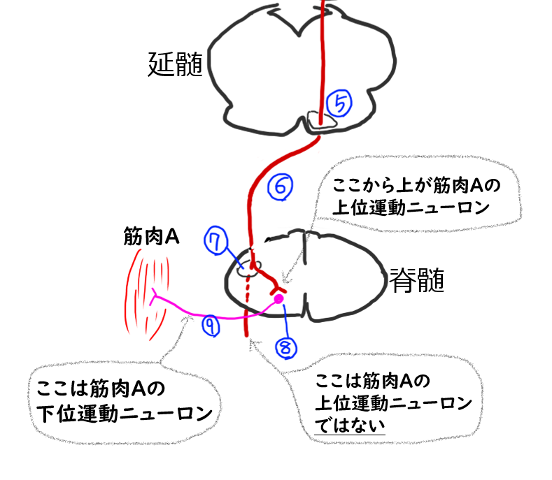 錐体路のうち、筋を支配する髄節レベルより”上”にある部分(一次運動野~脊髄前角)が上位運動ニューロンに相当します。この区間が障害されると、腱反射亢進・病的反射陽性(Babinski など)・表在反射低下または消失といった上位運動ニューロン徴候が出現します。(このことを錐体路徴候と記載しているテキストもありますが、上位運動ニューロン徴候が正しい表現です)
