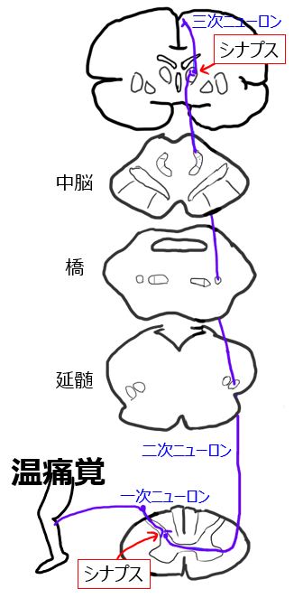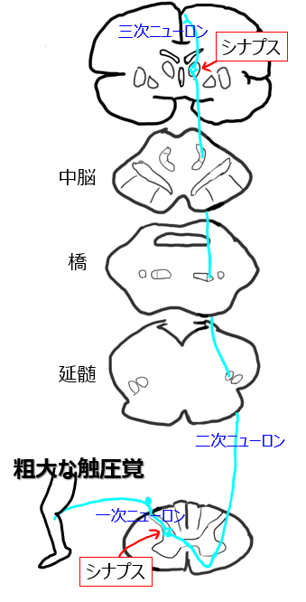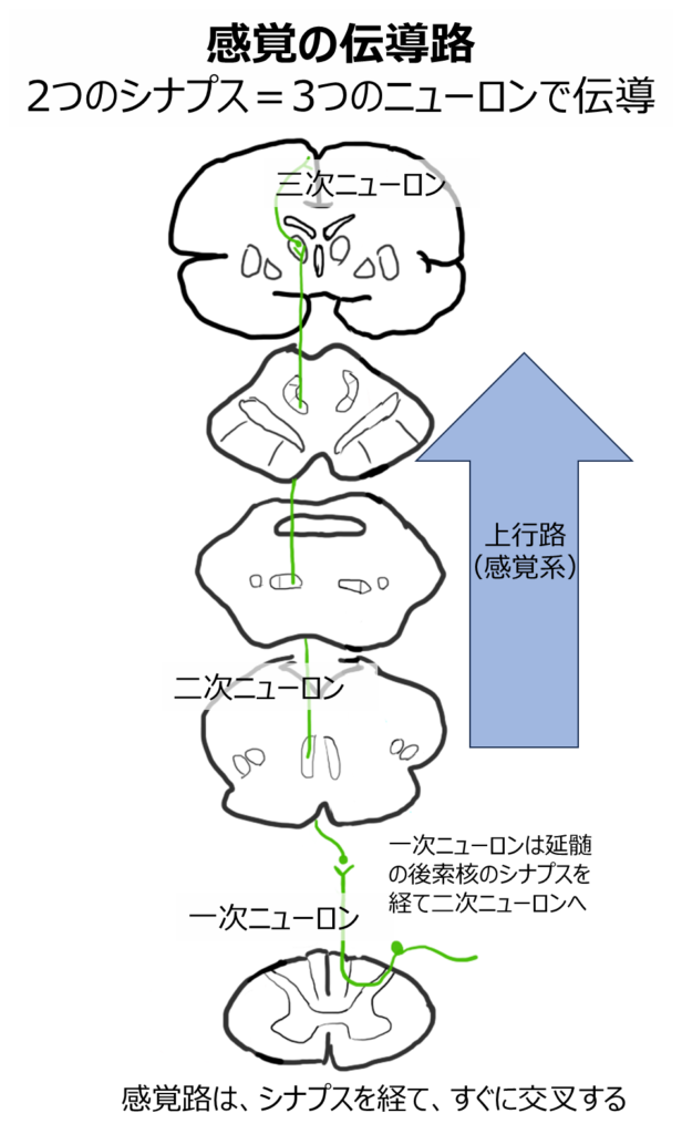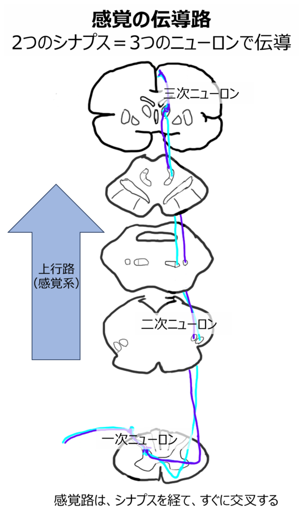 感覚は3本の神経細胞(一次・二次・三次ニューロン)によって中枢へ伝達されます。つまり、2つのシナプスを経て大脳皮質に到達します。