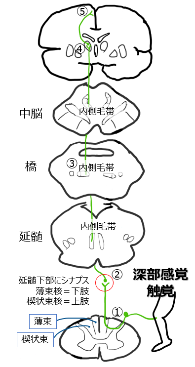 → 内側毛帯(内側毛帯路)を形成し、脳幹(橋・中脳)を上行