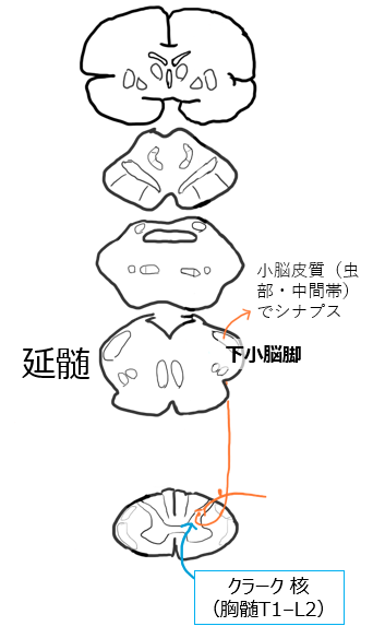 胸髄より下(L2以下)ではクラーク柱が存在しないため、上行してクラーク柱の高さでシナプスする