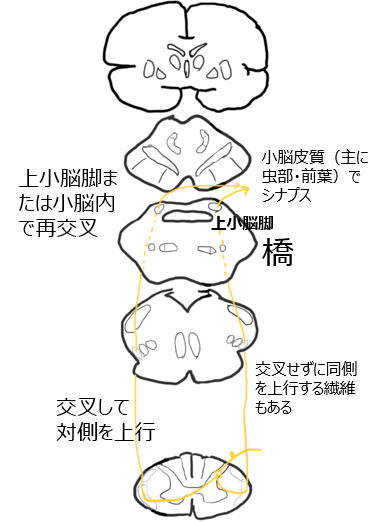起始側と同側の小脳へ、小脳皮質(主に虫部・前葉)で2回目のシナプス